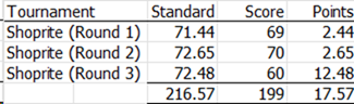 17.57 points as the three round standard (mid-level pro) is 3.57 over par or