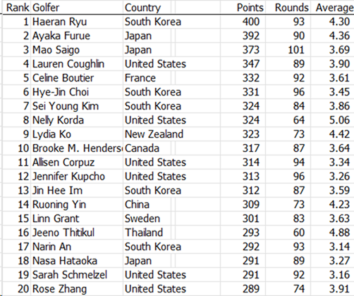 Hye-Jin Choi (329), Jin Young Ko (308), Jenny Shin (295) and a sixth place